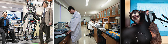 Em 2008, um robô em Kyoto (à esq.) andou graças ao pensamento de um macaco no laboratório de Nicolelis, nos Estados Unidos. Foi o ponto culminante de um trabalho iniciado em 1999, com a macaca Belle (à dir.). Entre as duas pesquisas, Nicolelis fundou o Instituto de Neurociência de Natal (centro) Foto/Auto Esporte