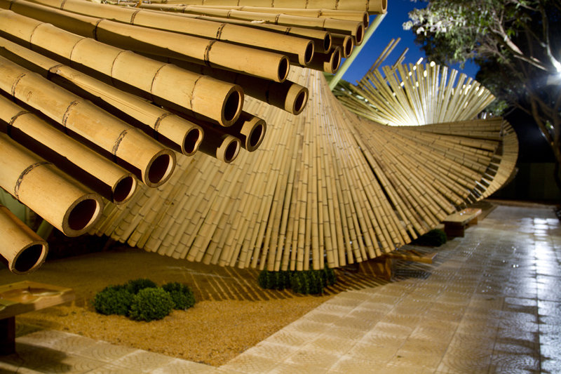 Bambus são usados na decoração da fachada da Casa Cor Brasília 2011. Projetada pelos arquitetos Regina, Eduardo e Sérgio Fittipaldi, a fachada destaca o tema da exposição "Dia a dia com a tecnologia" e sustentabilidade