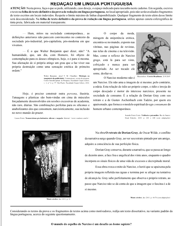 Muitos leitores enviaram mensagens aqui para o blog Edson Machado perguntando sobre o tema da redação do primeiro vestibular de 2012 da Universidade de Brasília: o mundo do espelho de Narciso é um desafio ao homo sapiens?