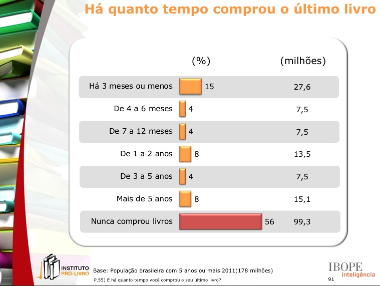 O Instituto Pró-Livro (IPL) divulgou nesta quarta-feira (28) os resultados da 3ª edição da pesquisa Retratos da Leitura no Brasil, o maior e mais completo estudo sobre o comportamento do leitor brasileiro, realizado entre junho e julho de 2011.
