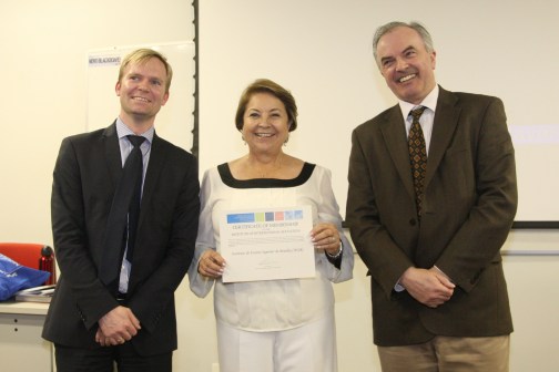 A professora Eda Machado, reitora do Centro Universitário IESB, recebeu certificado de agradecimento pela recepção, entregue por Daniel Obst (E), do IIE, e pelo professor Michael McDonough (D)/Foto: Dênio Simões