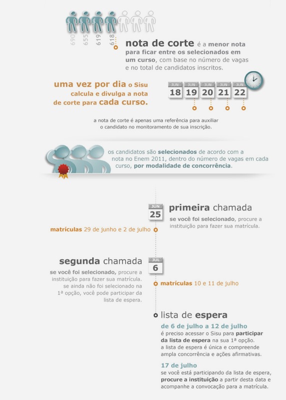 A primeira chamada será divulgada no dia 25 de junho. A matrícula nas instituições de ensino devem ser realizadas entre 29 de junho e 2 de julho. O candidato que for selecionado para a segunda opção ou que não atingir a nota mínima em nenhum dos dois cursos escolhidos pode permanecer no sistema e ser convocado na segunda chamada, que acontece a partir de 6 de julho. Quem não for selecionado em nenhuma das chamadas pode pedir inclusão em lista de espera.
