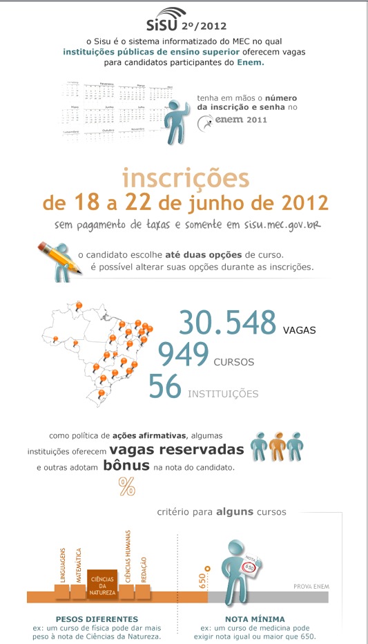 As inscrições para o Sisu (Sistema de Seleção Unificada) do segundo semestre começam nesta segunda-feira (18) e vão até as 23h59 do dia 22 do mesmo mês. Para participar da seleção é preciso ter feito o Enem (Exame Nacional do Ensino Médio) 2011. Os interessados poderão se candidatar a até duas opções de curso. Para o segundo semestre de 2012 serão ofertadas 30.548 vagas em 56 instituições públicas de ensino. Veja o site aqui.