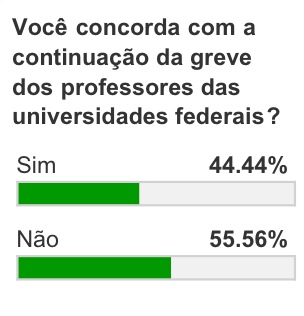 Esta semana fizemos uma enquete aqui no blog Edson Machado e 55, 56% dos nossos leitores responderam que não concordam com a continuação da greve.  A enquete ficou uma semana no ar e recebeu 268 votos.
