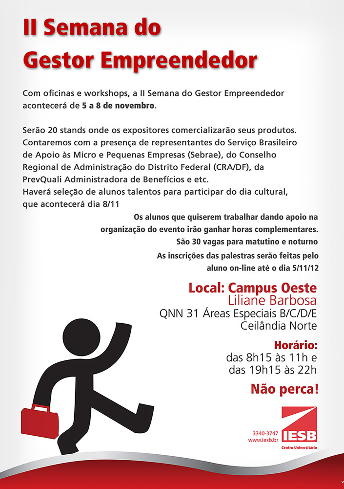 II Semana do Gestor Empreendedor Blog Educação30/10/201230/10/2012Agenda Navegação de posts AnteriorSeguinte O Centro Universitário IESB realiza a II Semana do Gestor Empreendedor, de 5 a 8 de novembro de 2012. Informações: www.iesb.br Compartilhe isso: Clique para compartilhar no X(abre em nova janela) 18+ Clique para compartilhar no Facebook(abre em nova janela) Facebook Clique para enviar um link por e-mail para um amigo(abre em nova janela) E-mail Clique para compartilhar no LinkedIn(abre em nova janela) LinkedIn Curtir Carregando... Relacionado