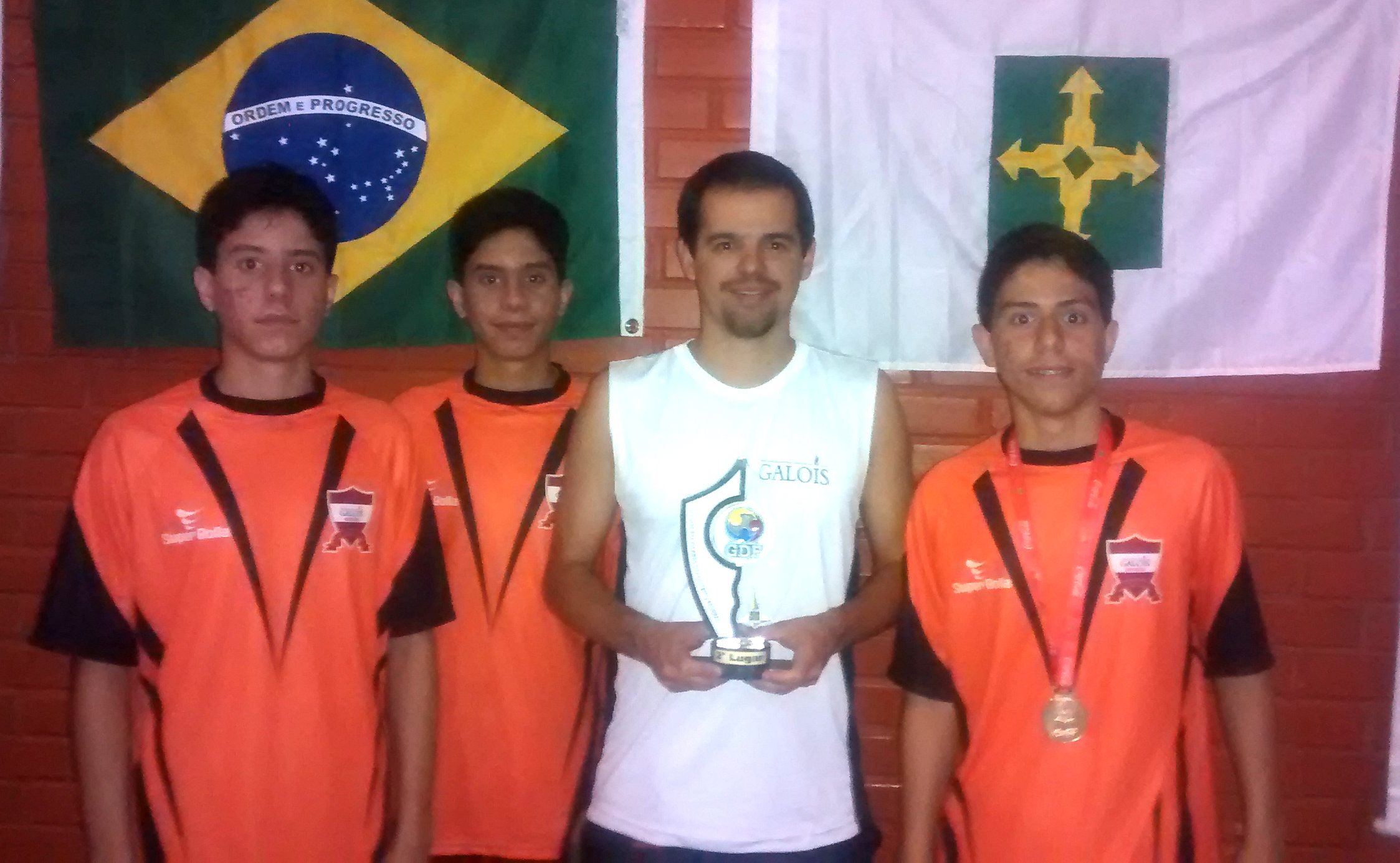 Os alunos do Colégio Galois, Sebastião Gilberto, Saulo José e Paulo José comemoram o sucesso conquistado nos Jogos Escolares do DF, na modalidade de Badminton. Sebastião Gilberto, do 9ºC, sagrou-se campeão da categoria 12 a 14 anos e ganhou uma passagem de ida e volta com hospedagem para disputar o Jogos Escolares da Juventude, que acontece em setembro, na cidade de Londrina (PR). Já o aluno Saulo José, do 1ºB, ficou em 3º lugar na categoria 15 a 17 anos e, junto do irmão Paulo José, conseguiu a 2º colocação por equipes na mesma categoria. O trio comemorou ao lado do professor de Educação Física do Colégio Galois, Roberto da Mata, que incentivou a prática do esporte.