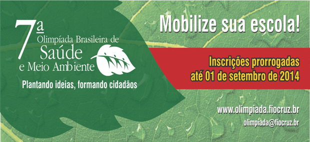 Com o objetivo de incentivar a realização de trabalhos que contribuam para a melhoria das condições ambientais e de saúde no Brasil, além de possibilitar que o conhecimento científico se torne próximo do cotidiano escolar, a sétima edição da Olimpíada Brasileira de Saúde e Meio Ambiente (OBSMA) está com inscrições abertas até 1º de setembro de 2014 pelo site: http://www.olimpiada.fiocruz.br. A ação contempla os projetos realizados por alunos do 6º ao 9º ano do Ensino Fundamental e do 1º ao 4º ano do Ensino Médio, incluindo os ensinos profissionalizante e de jovens e adultos (EJA), nas modalidades Produção Audiovisual, Produção de Texto e Projeto de Ciências.