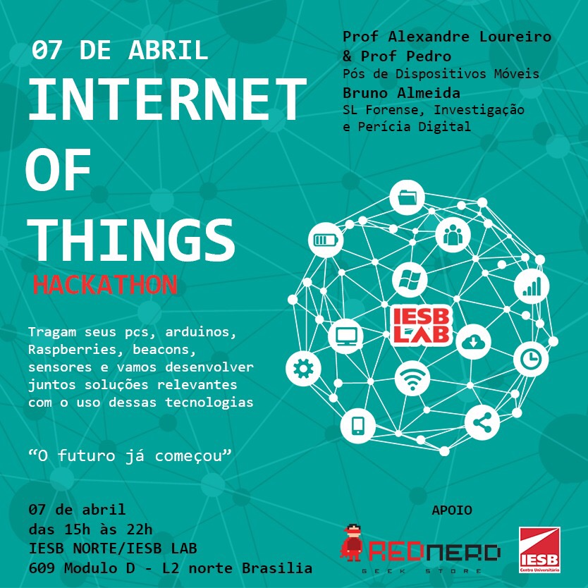 Antenado com as novidades do mundo e as exigências do mercado de trabalho, o Centro Universitário IESB, em Brasília, promove dois eventos de tecnologia no próximo dia 07/04, sexta-feira. Das 15h às 22h, o IESB Lab realiza um hackathon em parceria com a Rednerd. Durante a maratona de programação, gratuita e aberta à comunidade, os participantes desenvolverão o tema Internet of Things (IOT). Todos receberão a mentoria dos professores Alexandre Loureiro e Pedro Henrique Figueiredo, do curso de Pós-Graduação de Dispositivo Móvel do Centro Universitário IESB, e também de Bruno Almeida, presidente da SL Forense, Investigação e Perícia Digital. Para participar, basta aparecer no IESB Lab, que fica dentro do Campus Norte do Centro Universitário IESB, na 609 norte, munido de PCs, arduínos, raspberries, beacons e sensores para desenvolver soluções relevantes com o uso dessas tecnologias.