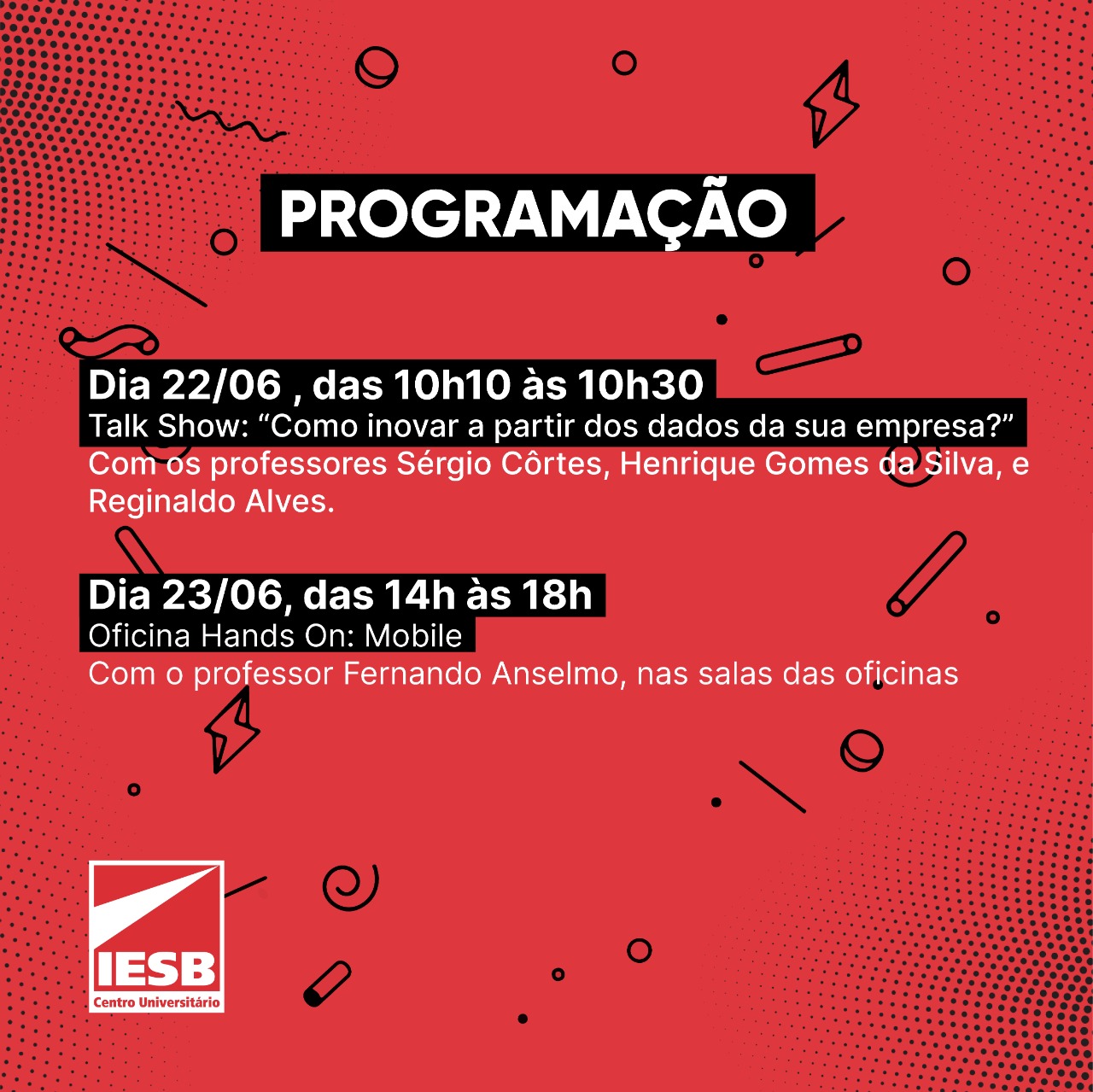 No line-up da programação, no dia 22/6, das 10h10 às 10h30, o IESB promove o Talk Show “Como inovar a partir dos dados da sua empresa?”, com os renomados professores da instituição como palestrantes. Participam os professores Sérgio da Costa Côrtes, coordenador dos cursos de pós-graduação em Ciência de Dados e Inteligência Artificial; Henrique Gomes da Silva, professor convidado no curso de pós-graduação em Business Intelligence; e Regiano Alves, coordenador dos cursos de pós-graduação em Análise e Desenvolvimento de Sistemas, Banco de Dados, Business Intelligence e GeoAnalytics.
