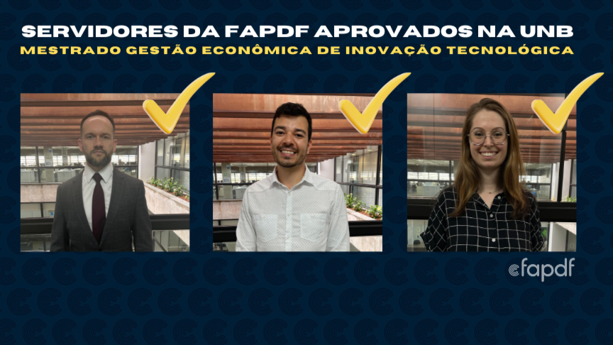 O processo seletivo para concessão de bolsas para o curso de Mestrado Profissional em Economia, na área de Concentração em Gestão Econômica de Inovação Tecnológica, foi realizado no dia 8 de março deste ano. Foram aprovados os servidores da FAPDF Andrey Rank de Vasconcelos, procurador Jurídico; Verena Guerios Serpa, assessora da Procuradoria Jurídica (Projur) e Breno Lima Barão, analista em Gestão e Assistência Pública da Unidade de Controle Interno e Gestão de Riscos (UCIGR) da Fundação.