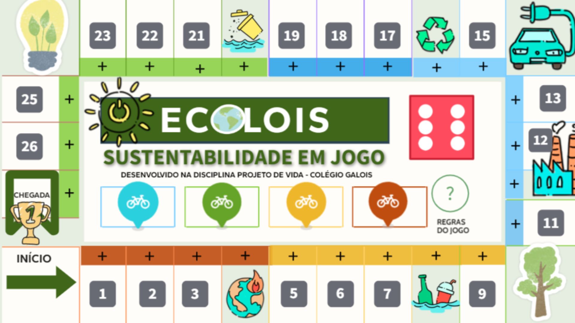 Em comemoração ao Dia Mundial do Meio Ambiente, 5 de junho, alunos da 1ª série do Colégio Galois desenvolveram um jogo de tabuleiro digital com alertas e dados atualizados sobre a importância da preservação do planeta. O material é gratuito e pode ser acessado no link: Ecolois: sustentabilidade em Jogo.
